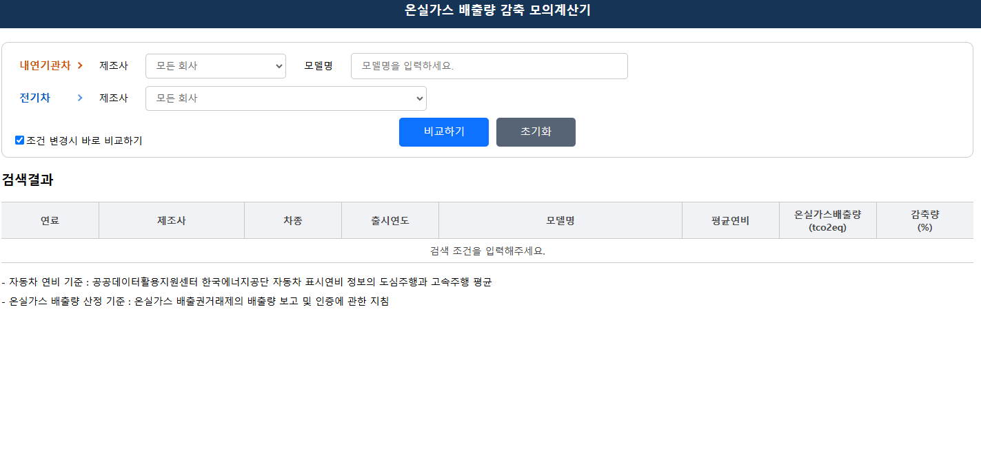 제조사와 모델명을 입력하시면 온실가스 배출량 및 감축량 등을 확인하실 수 있습니다.
